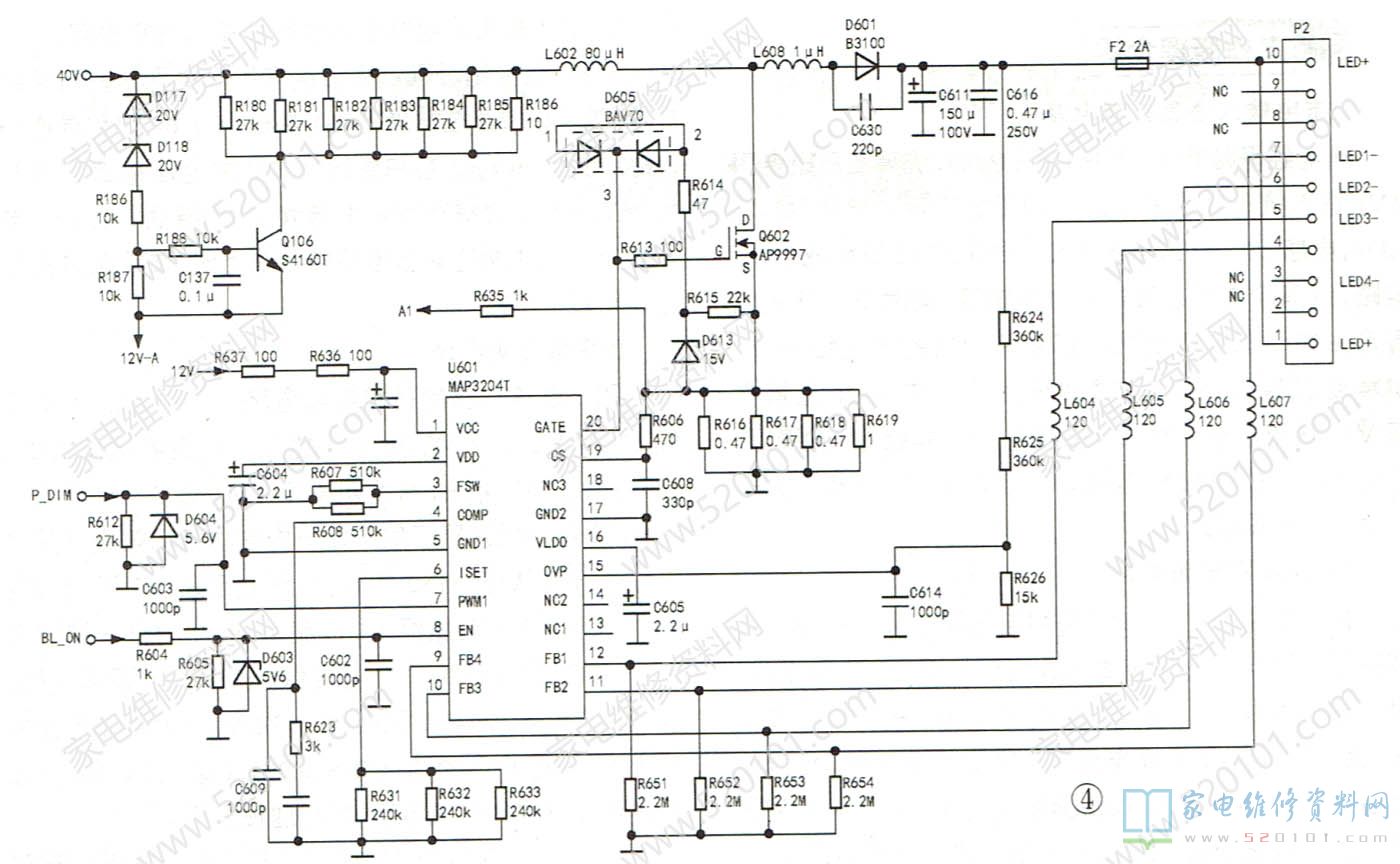 4路LED背光灯串组电源输入LED+端。由背光灯串组返回的4路LED背光灯串组末端LED1-~LED4-通过P2及电感L604~L607接到U601的⑨~12脚,接至IC内部亮度控制功率场效应管的漏极。当亮度控制电平增大时->U601⑦脚电平升高->内藏亮度控制功率场效应管栅极电平升高->导通程度增加->通过的电流增大->LED灯串组流过的电流上升->背光变亮;反之,则反。当U601使能端⑧脚为低电平时->U601内部的振荡器停振->20脚无激励脉冲输出->升压管Q602停止工作。同时,U601内部的亮度控制功率场效应管也截止->LED背光灯串组无电流流过->背光不亮。