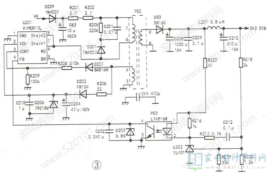 图3是该电源的待机电源电路。300V的VA电压经D209、R201、R202及TS2的⑦-⑥绕组送入U201(VIPER17L)的⑧脚(电源开关管漏极,兼启动电源端),U201内部的振荡器开始工作->内含功率场效应开关管工作于开关状态->TS2储能;在开关管截止期间,TS2③-④绕组的感应电压经D202整流、C204、C215滤波及D205钳位后得到约17V电压供给U201电源端②脚,以替代启动电源。与此同时,TS2次级⑧-⑨绕组产生的感应电压,经DS3整流、C208、C209、L201及C210滤波后得到3V3STB待机电压,然后送往主板。