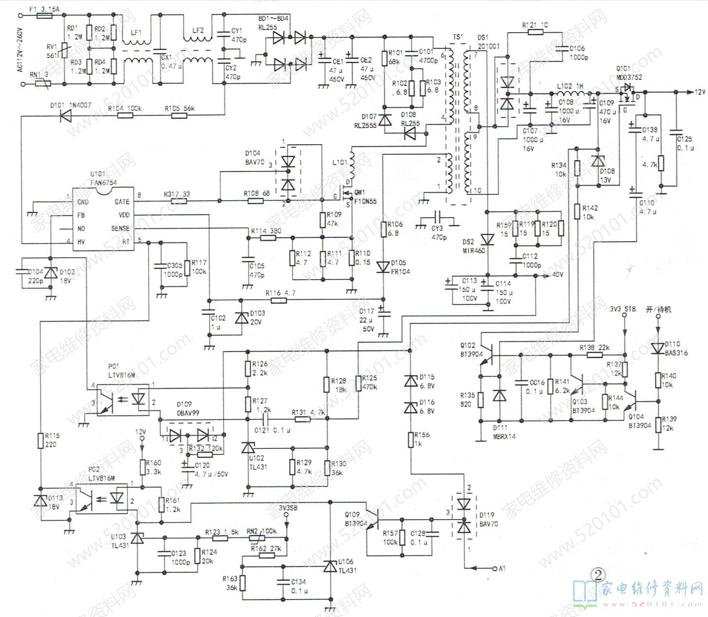 控制芯片U101(FAN7654 )与它周边元件构成并联调宽型开关电源。300V的VA电压加至QW1漏极,同时市电经R105、R104、D101送至U101高压启动端④脚,为振荡器提供启动电源,IC内部的振荡器、脉宽调制器工作产生的开关激励脉冲使QW1工作于开关状态。由于电磁感应,TS1②-①绕组产生的感应电压经D105整流、C117滤波D103钳位后,得到约17V电压送往u101⑦脚,为u101供电。同时,TS1次级⑦-10绕组产生的感应电压,经DS2整流、C113、C114滤波后,得到40V电压送往LED驱动电路,作为升压电路的输入电源。与此同时,次级⑨-10绕组产生的感应电压经DS1整流、C107、C108、L102、C109滤波及D108钳位后,得到12V-A电压,一路作为稳压系统的取样电压,另一路送往输出开关管Q101 (MDD3752)的源极,经Q101开/关控制后输出12V电压。