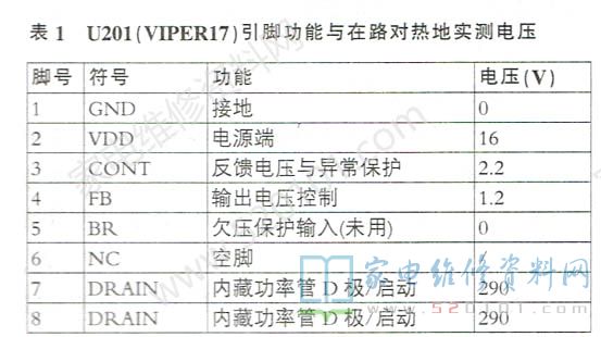 故障现象1:无3.3VSTB待机电压输出。分析检修:首先应检查U201⑧脚电源启动端是否有约+290V电压。如果没有,检查市电的输入、整流滤波电路。若有电压,则测启动电压形成电容C215(1uF)两端是否有大于15V的启动电压。若没有,在测得C215正常的情况下,说明U201内部充电电路损坏;若有大于15V的启动电压,可断开L201右端试机,检测C208正极是否有待机电压输出。若有输出,且电压很高,表明故障是输出过压所致。如果输出电压基本正常,则表明负载有短路故障。若仍无输出,表明故障在电源本身,断开U201④脚外接电路试机,测C208正极是否有电压输出。若有很高的电压输出,说明故障在稳压控制环路。否则,故障在U201②、③脚外接的整流滤波电路或U201本身。U201的引脚功能与参考电压见表1。