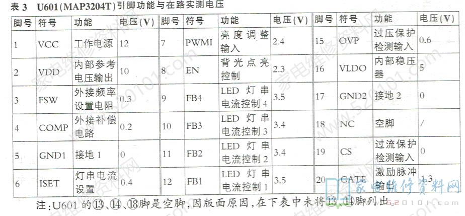 故障现象4:背光灯不亮。分析检修:首先检查U601①脚(电源端)是否有12V电源电压,开关管Q602漏极是否有40V电压,U601⑦脚(亮度控制)、⑧脚(背光点亮)电压是否大于2V。在上述脚供电正常的情况下,测升压输出端是否有约35V电压。如果没有,问题可能是升压电路(包括Q602、L602、D601、C630、C616等)或负载有故障,接下来检查MAP3204T的20脚是否有开关脉冲(直流电压+1.4V)输出,若在开机后- 直没有输出,说明MAP3204T损坏,可代换一试。假若开始有输出,但随即消失,则可能是过流保护电路(含过流保护电路本身故障,比如过流取样电阻阻值变大或焊点接触不良)动作所致,可从U601的19脚电压是否大于0.5V来判断。如果查得故障非过流保护所致,则说明故障有可能是因保险管F2熔断,或输出插座P2电源输出端①、10脚与插头接触不良而引起输出过压保护所致(这类过压因电压未到达LED灯串,所以灯串不会瞬间点亮)。MAP3204T引脚功能与参考电压见表3。