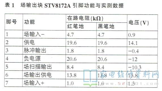 接修一台TCL HD29M06型高清彩电,开机后屏幕下面2/3处有一条水平亮线,并有几条回扫线。拆开机壳,直观检查场输出集成块STV8172A及其外围元件无明显损坏现象,用数字万用表测量场输出块各脚电压,①~⑥脚电压基本正常,⑦脚电压约为0.4V,而正常电压为1.3V。STV8172A工作频率范围宽,可达50MHz~120MHz,输出最大电流可达3A,并内置有输出短路、电源短路、过压、过温等保护电路,适用于大屏幕电视机,其引脚功能见表1。