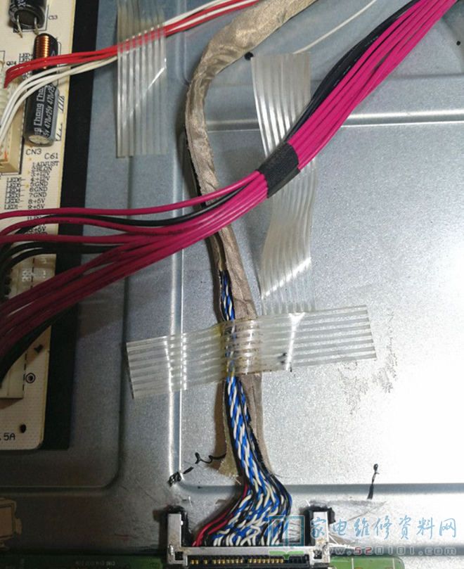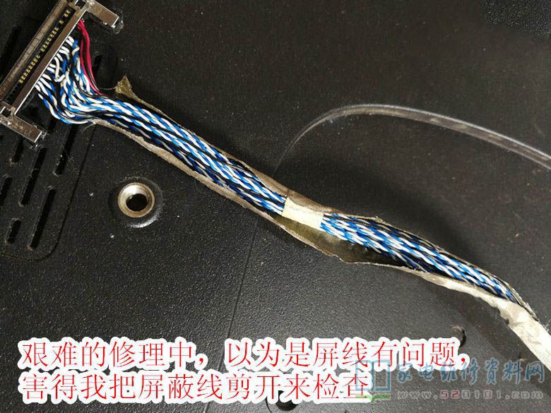 因为时间关系,艰难的检修过程在此就不叙述了。直接挑明原因,经过艰难的探索才发现,造成这种故障的原因是:屏线上的金属屏蔽了线没有良好的接地,致使屏蔽线与屏铁体摩擦产生的干扰信号干扰了逻辑板正常工作,所以出现了图片上的现象。厂家意图是通过胶带来把屏蔽线压在铁壳上,以此来完成屏蔽线的接地工作,没有考虑到屏蔽线氧化产生接触不良的后果。在我修之前厂家的师傅也认为是逻辑板的事情,所以直接换了逻辑板以为就了事了。