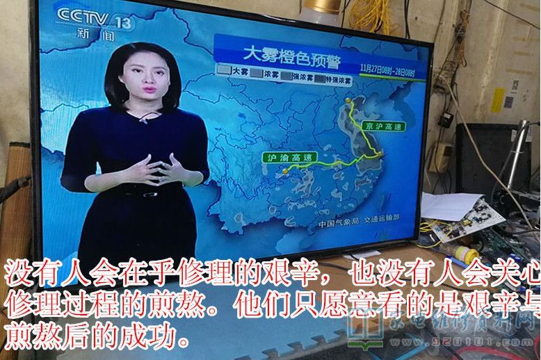 做修理的人一看故障现象都知道,这是屏幕问题。我把电视机拉回到店里之后,也是打算把它送给修屏的师父修的,因为我没有修屏的条件,就算不是修屏,凭我这半桶水的功夫,恐怕也啃不动这块硬骨头。