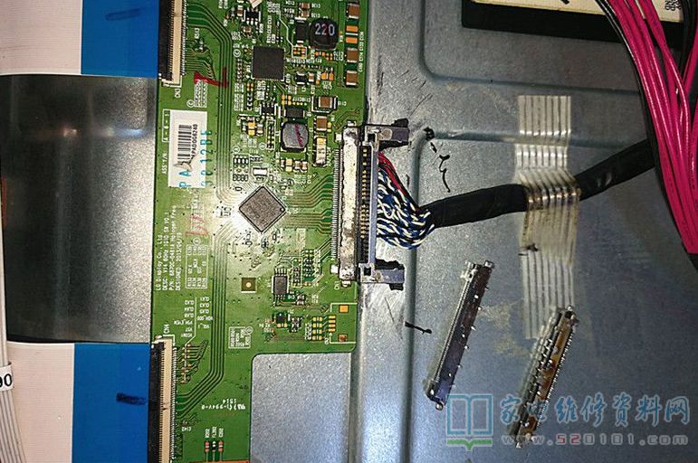 打开电源,此时屏幕竟然出现亮丽的开机画面,大大出乎我的意料,用手拨动逻辑板屏线插头(这个部位是我修液晶电视机花屏故障最喜欢摸的),屏幕上跟随有反应,想不到看似多么难啃的骨头竟然是这么简单的接触不良故障,呵呵,我心里一下子激动起来了,想想这五百多块(和用户商量好这个价钱的)就有些兴奋。可是看似简单的事情就此拉开了这一次探索性维修,挑战着我这半桶水智力和毅力的极限: