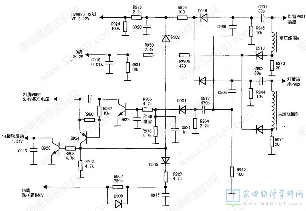 第三路: 在C906下端和地串联电阻R942上取得取样电压,C913隔直流D901整流、C921滤波后经R966送Q922的b极。正常时Q922是截止的,当R942上脉冲电压过高时,Q922、Q924导通,5.4V基准电压通过Q924分成3路输出:通过D902加到12脚;通过D905加到15脚;通过R903使Q923导通,使14脚电压为0v(该脚是软启动控制,电压和输出脉冲占空比成正比例关系,启动时C916的充电过程使输出脉冲占空比逐渐增加)。在三路电压共同作用下芯片立即停止工作。