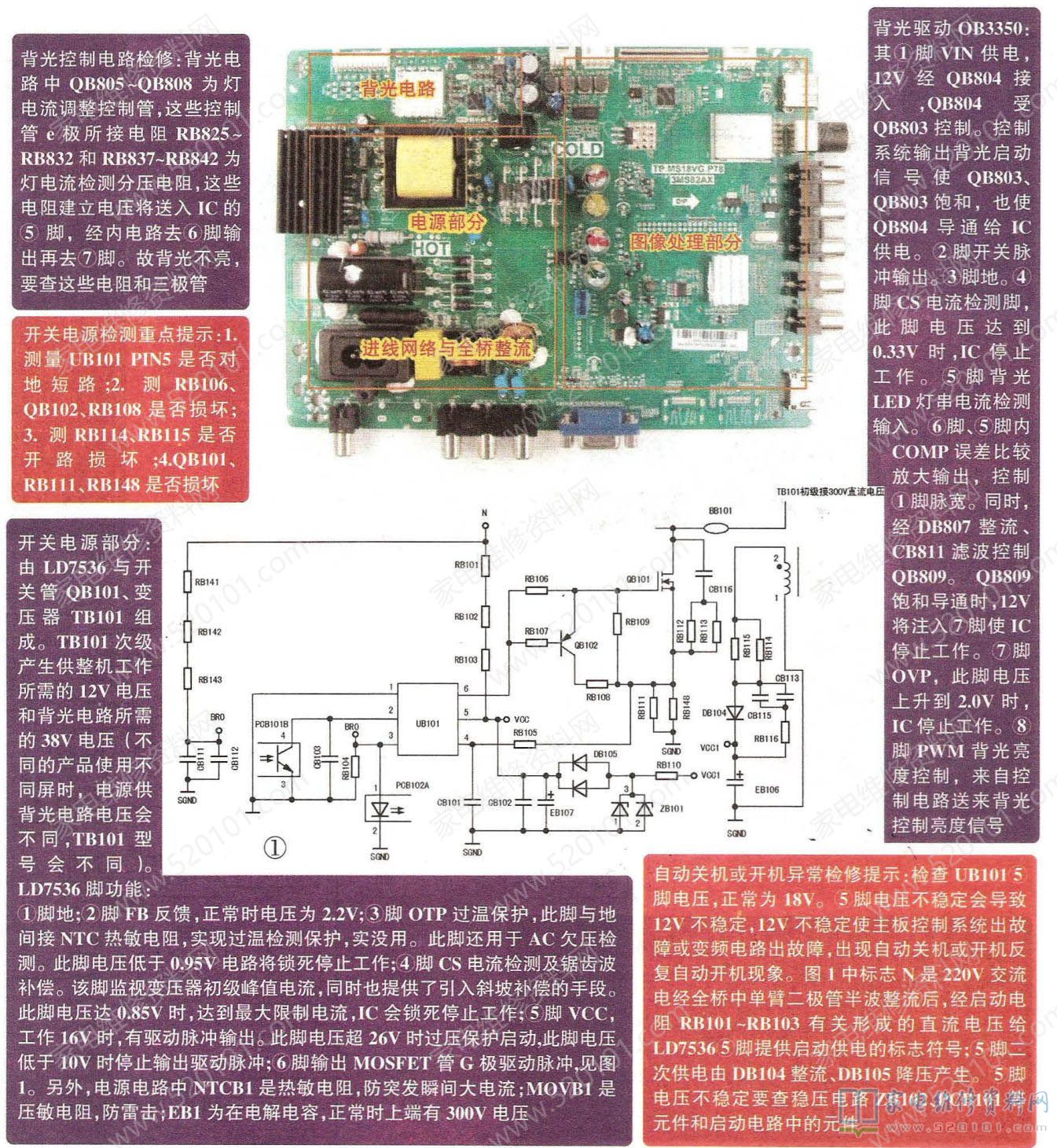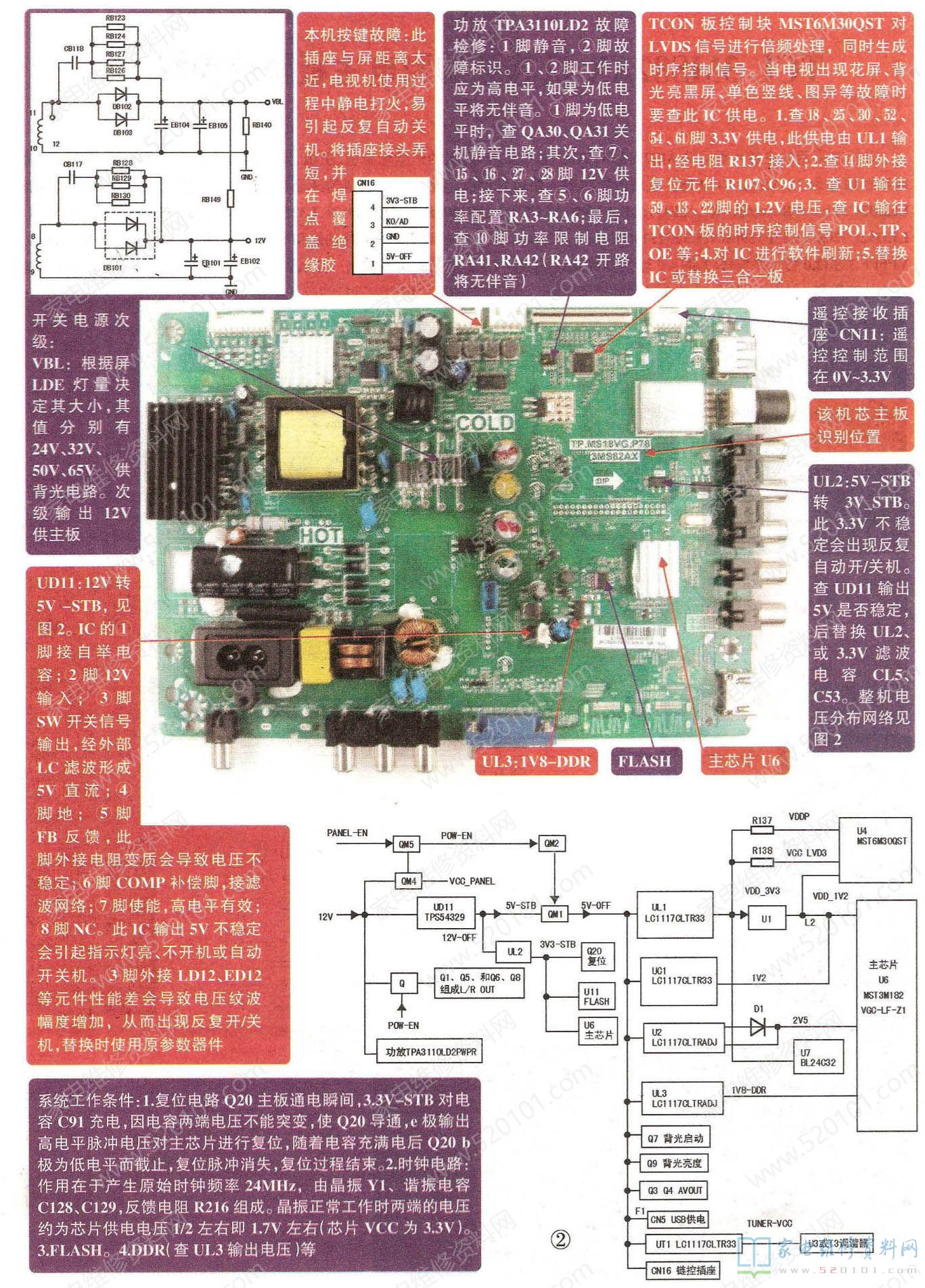 整个机芯除不具有网络功能和DTV功能外,能实现对射频RF、VGA、YPbPr,USB2.0各1路信号、2路AV输入、3路HDMI输入接收与处理,并能输出-路AV信号和一路耳机信号。USB多媒体信号支持音乐和文本同时播放,支持多种视频文件播放。下面就该机芯主板维修进行图解。