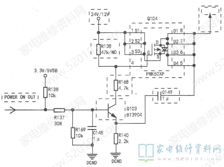 维修小结:该机在待机时电源板也是输出12V,Q104 为开/待机控制管,当待机时由于Q104漏电,导致数字板二次开机不能复位,从而不能开机。