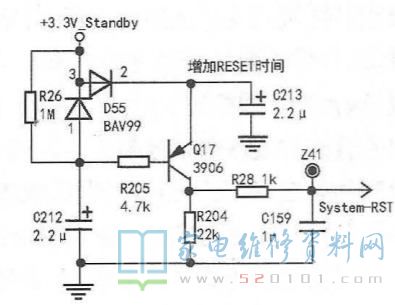 仔细思考,是不是复位不正常呢?故障时检查复位控制电路(这部分电路如图1所示),测得复位三极管Q17的各极电压:e极2.7 V,b极2.1V,c极2.2V,管子处于导通状态,不正常。按图分析,复位三极管Q17此时应该处于截止状态,其c极电压应该为0V。出现如此情况,应该是Q17的b极电压降低所致,怀疑电容C212不良。更换C212后长时间试机,一切正常机器不再自动关机,检测Q17各极电压:e极3.1V,b极3.08V,c极0V,Q17处于截止状态。