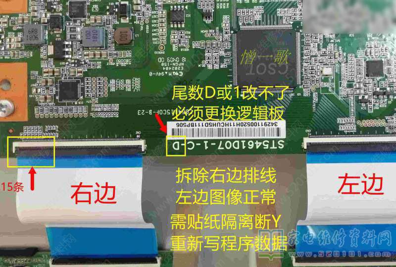 华星ST5461D07液晶屏灰屏的断Y技改维修方法 2023-02-04 02:22:06 阅读 3628 次 评论 0 条 摘要: 针对华星ST5461D07液晶屏灰屏,彻底解决断Y网粗线技改方法,如下图所示,有数据包,没有编程器可以在网上搞一块写好程序技改好的逻辑板才55元。注意: 图中逻辑板拆除右边排线左边图像正常,反之拆除左边排 针对华星ST5461D07液晶屏灰屏,彻底解决断Y网粗线技改方法,如下图所示,有数据包,没有编程器可以在网上搞一块写好程序技改好的逻辑板才55元。注意: 图中逻辑板拆除右边排线左边图像正常,反之拆除左边排线右边图像正常原理一样,不懂自己找原因,逻辑板中两块黑块,平时也懒得拆图像一样正常。 附:技改数据 版权声明:本文为转载文章,版权归原作者所有,欢迎分享本文,转载请保留出处! 点赞 分享: PREVIOUS:杂牌机PB.VST59S.PB813主板二次不开机的维修 NEXT:用UTC2003伴音模块修复50英寸组装机无声音的过程 文章导航