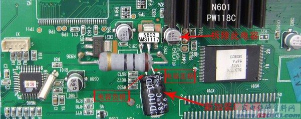 由于C641(贴片电解电容)周围存在发热量大的芯片如:PW118、N603(AMS1117)等,长时间使用后会造成C641(10V100u)容量变小,导致无法滤除N603(AMS1117)输出端的自激振荡,使得N603(AMS1117)的输出电压产生干扰脉冲,造成PW118停止工作,最终引起黑屏。为了防止C641(10V100u)漏液后引起短路,所以将其拆除,并在N603(AMS1117)的输出端并联上容量较大的电解电容替代。把改机的电解电容放置在下图中的所示的位置,使其远离发热源防止再次损坏。