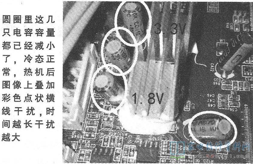 试机发现刚开机时一切正常,大约十几分钟后屏幕左侧开始有彩色的点状横线干扰出现,但图像、颜色、伴音都正常,随时间增长干扰逐渐加重,点状横线干扰从液晶屏左边延伸到右边,左边全屏都是。既然逻辑板已代换,故障应该是主板,为了准确判断,用吹风机的冷风给主板散热,当给主芯片这部分散热时,彩色的点状干扰消失,加热故障便出现,说明问题就在这块。