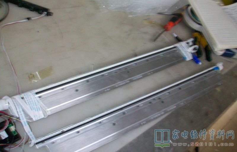 接修一台TCL L46E5500A-3D液晶电视(MS801机芯),故障表现为通电试机,一个小时后屏幕左上角发黑。打开机器待故障出现时测量背光板到灯条上的电压,该背光板到屏内LED灯条供电共有4组,除供电外每组线上有4个电感。出故障时第3组上的4个电感L7、L8、L9、L10两端电压均为0V,而相应的其他3组外接4个电感上4路电压为1.1V、1.2V、1.3V、1.4V。该4路电压分别由U1( OZ9909TN )控制3和4路,u2( OZ9909TN)控制1和2路,为尽快圈定工作范围,将U1和U2对调后故障区域会有所改变,由此确定U1(OZ9909TN )是有问题的。网购OZ9909TN后上机试机一天故障再未出现。