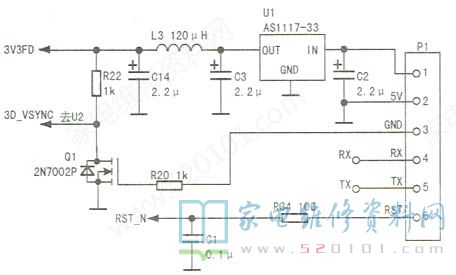 接修一台L50F3600A-3D液晶电视(MT55机芯),在收看3D节目时图像向上翻滚。当用户打开3D功能时,主芯片UM1会通过3D_ EN端口给显示屏发出一个3D使能信号,屏进入3D工作状态;同时,主板启动3D背光驱动模式,UM1提供3D_ DIM控制。接下来,主板通过蓝牙发射电路天线向眼镜镜框内的蓝牙接收电路发送3D复位信号和场同步信号,使镜片开关电路和镜片驱动电路与液晶屏同步工作,以正常观看3D节目。为区分故障部位,试用该机眼镜在同品牌其他机上观看3D电视,一切正常,显然问题在电视机内部。重点检查3D_VSYNC电路,如图所示,发现电阻R22一端虚焊。补焊后试机,故障排除。