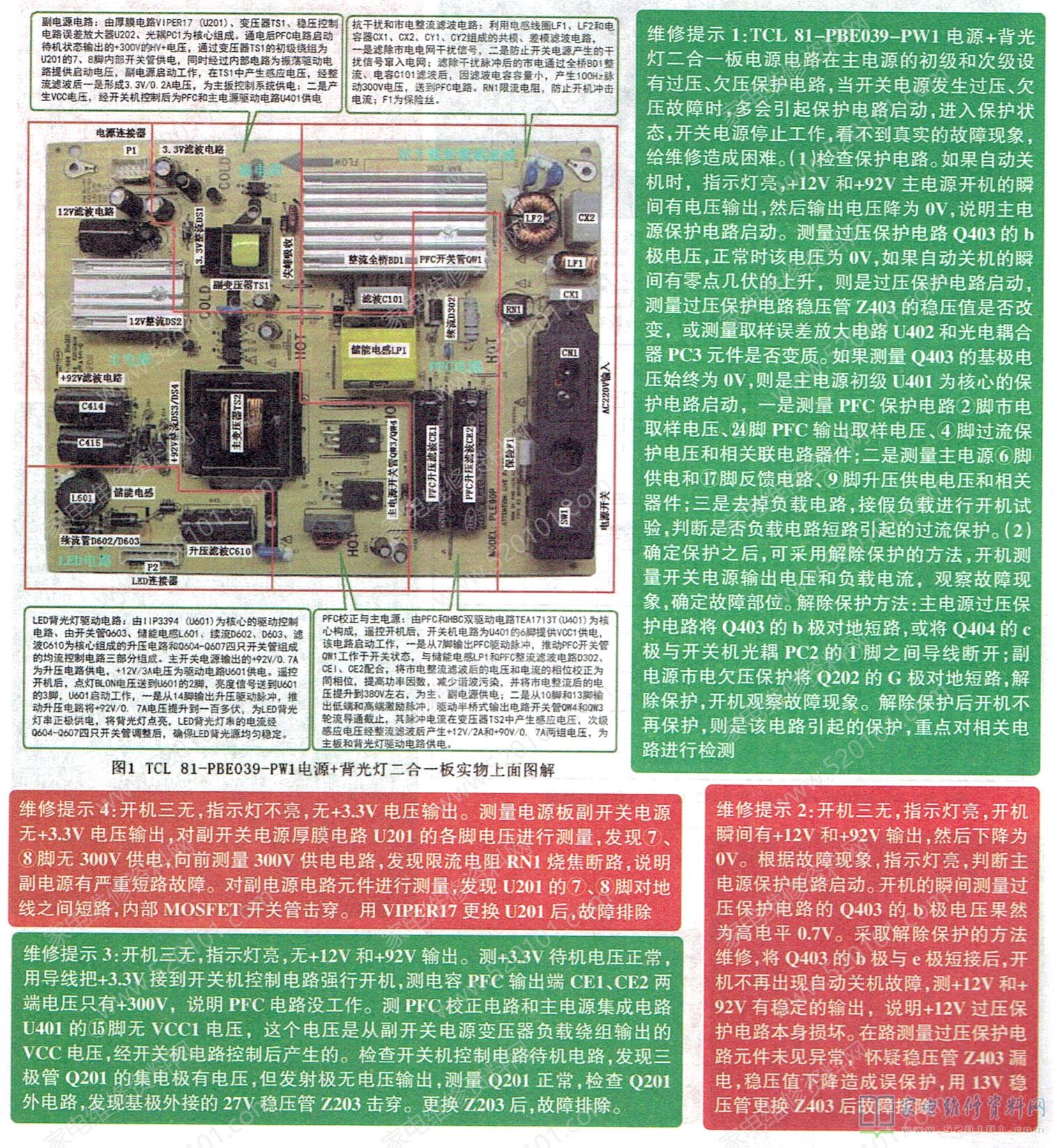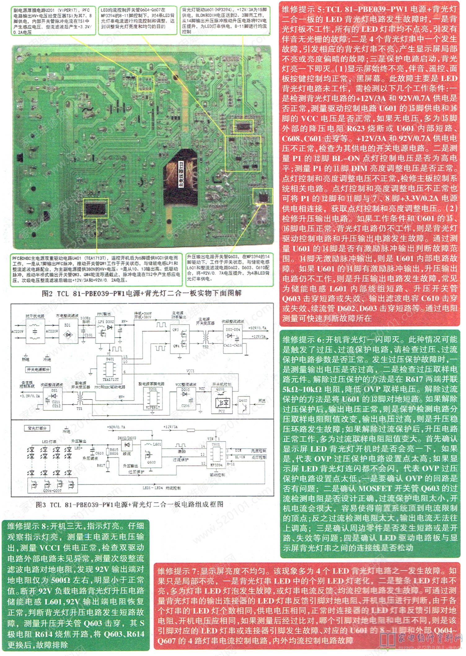 TCL 81-PBE039-PW1电源+背光灯二合一板上面元件分布实物图解见图1所示,下面元件分布实物图解见图2所示,电路组成框图见图3所示。