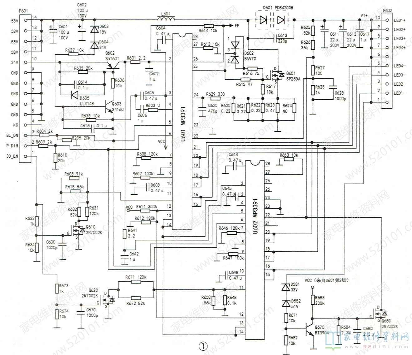 在开关管截止瞬间,储能电感L601感应出的自感电动势的方向是左负右正,与+58V电源供电叠加,经升压二极管D601整流、C611、C612、C617滤波后得到约+105V电压(3D状态为+115V。注:四路LED灯串中,每路有33只大功率LED)。该电压分为两路:一路送到LED灯串插座P602的⑦~10脚(分别接至背光板四路LED灯串的首端),另一路送到由R625~R628等构成的分压电路,获得输出过压取样电压,并送到MP3391的输出过压保护检测端②脚及过压保护控制管Q680(2N7002K)的漏极。背光板上LED灯串的末端通过插座P602的②~⑤脚与MP3391的13~20脚相连。在P601②脚输出的亮度开关脉冲的控制下,MP3391内部背光亮度控制管导通,即灯串供给电压经LED灯串及MP3391内部的功率MOS管到地形成电流,四路LED灯串被点亮。