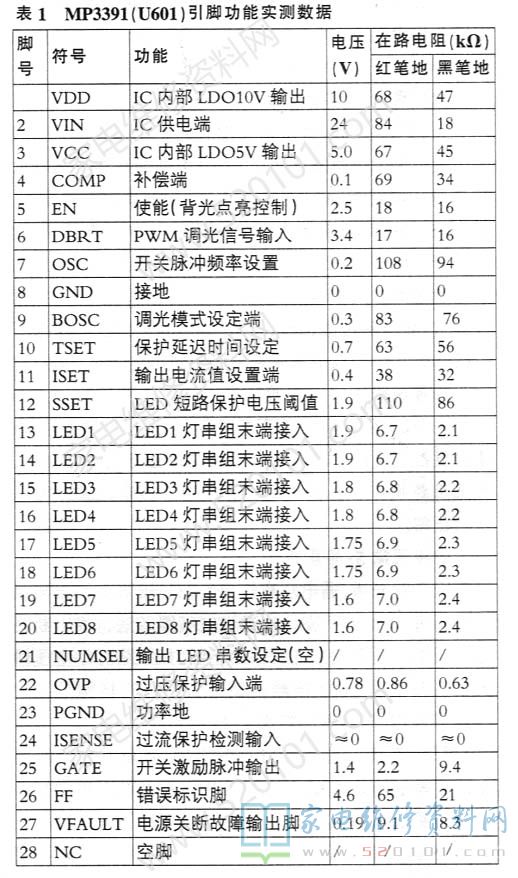 表1给出了MP3391引脚功能与在路2D状态下实测电压、电阻数据,供参考。