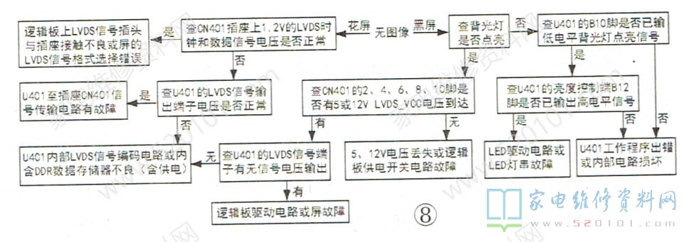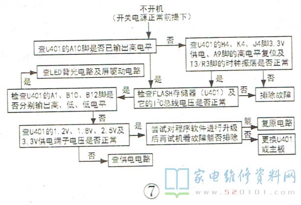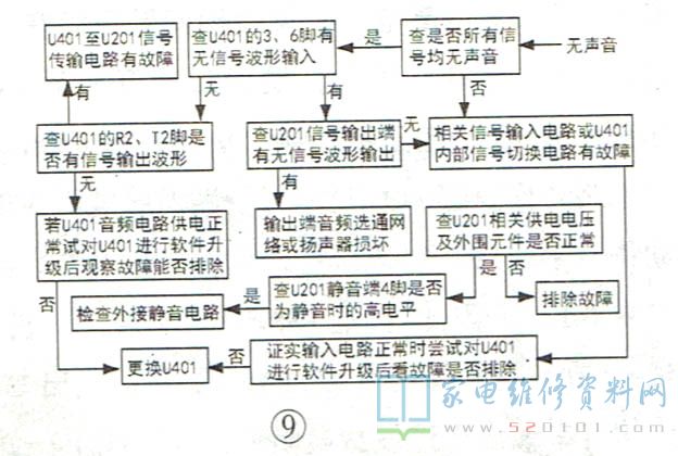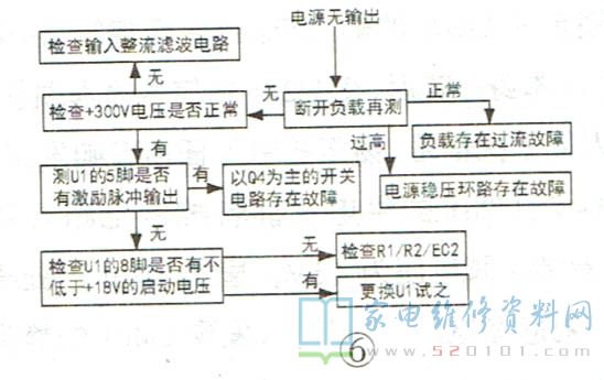 该机芯彩电的常见故障有电源无输出、不开机、无图像、无声音,其检修流程如图6~图9所示。