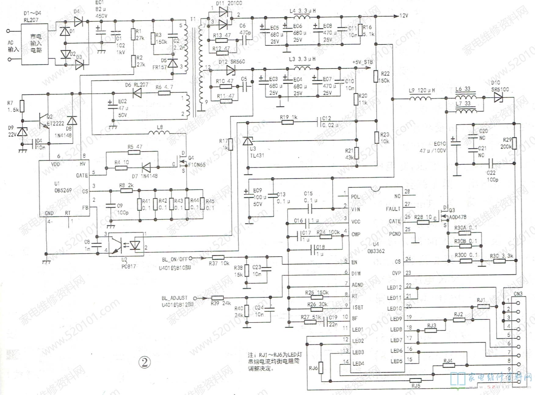 该机芯彩电开关电源与LED驱动电路见图2。市电经输入、整流滤波电路后获得 +300V电压,该电压分为两路:一路经开关变压器T1⑤-③绕组、电感L8加至开关管Q4的漏极;另一路经R1、R2送到开关电源控制芯片U1(OB5269)启动电源端⑧脚,开关电源工作。T1次级①-②绕组产生的感应电压经D6整流、EC2滤波、Q2、D9稳压后,获得约18V电压替代启动电源为U1⑥脚供电;⑨-⑦绕组产生的感应电压经D11整流,EC5、EC6、L4、EC8、EC9等滤波得到12V主电压;⑨-②绕组的感应电压经D12整流,EC3、EC4、L3、EC7等滤波后获得+5V_STB电压。U1内部相关电路和U2、U3及它们的周边相关元件组成稳压环路。