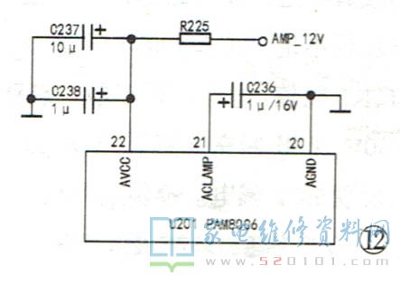例6:一台乐华LED42C820型彩电,开机约30min后开始出现“沙沙”杂音,严重时甚至盖过正常伴音。为了区分故障部位,断开音频功放块U201的输入端试机,扬声器中仍有杂音,看来故障源应在U201或它的周边电路中。检测u201各脚电压,发现21脚(VCLAMP)电压从开机时的2.6V逐渐下降,约经30min后电压降为1.5V,且上下波动。该脚外部只接了一个电容C236(1pF/16V),相关电路见图12。怀疑C236有问题,换新后开机,故障消失。