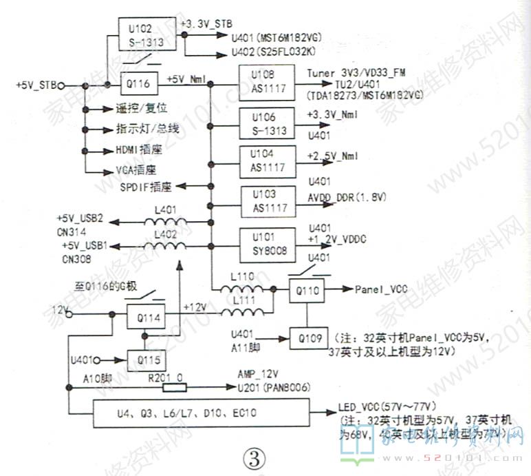 该机芯电源流程见图3,输出两路电压:一路是+5V STB电压,此电压第1路经直流电源变换块U102降为+3.3V_STB电压,送往主控芯片U401 (MST6M182VG) 的H4、K4J4脚及FLASH (兼EEPROM)存储器U402(S25FL032K);第2路主要送给遥控、U401复位、指示灯、I2C总线等电路及HDMI、VGA信号输入插座;第3路经Q116 (Q116受控于Q115,Q115又受控于U401的A10脚)开/关控制后输出+5V Nml电压,此电压又被分为6路输出:第1路经U108(AS1117-3.3)降为Tuner 3V3/VD33_ FM电压,送往硅高频头UT2(TDA18273)及U401的T4脚外接电阻R049的供电端;第2路经U106(S1313)降为+3.3V_ Nml电压,送往U401的L6、M6.K5.L5J5.M5脚;第3路经U104 (AS1117-2.5)降为+2.5V_ Nml电压,送往U401的N5、P5脚;第4路经U103(AS1117-1.8)降为AVDD DDR电压,送往U401的M10、M11、D9、G8脚;第5路经U101(SY8008)降为+1.2V_VDDC电压,送往U401的H7、H8、J7、J8、K7、K8、L7、L8等脚;第6路经电感L110送到控制管Q110(AO3401A)源极(Q110受控于Q109,Q109又受控于U401的A11脚),开/关控制后作为32英寸机的上屏电压Panel_vcc。