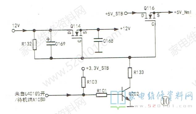 二次开机后指示灯闪烁数秒后又重新点亮,表明主控芯片在运行开机程序过程中受阻。开机程序通常存储在FLASH存储器中,若FLASH损坏或与MCU通讯中断,就会引发该故障。查FLASH(位号为U402)与U401的通讯总线电压正常,换上存有原始数据的FLASH开机,故障现象不变。考虑到要正常运行开机程序,相关电路的上电须遵循一定时间顺序。否则也会出现该故障。当对电源供给电路进行检查时,发现5V输出控制管Q116已击穿(相关控制电路见图10)。当Q116击穿后U401的遥控及复位电路的供电时刻与U401的+2.5V.+1.8V及1.2V等供电电路的供电时刻是相同的。由图3所示的电源流程图可知,遥控及复位电路的供电时刻是要提前于上述电路的。更换Q116( A03401A)后开机,故障排除。