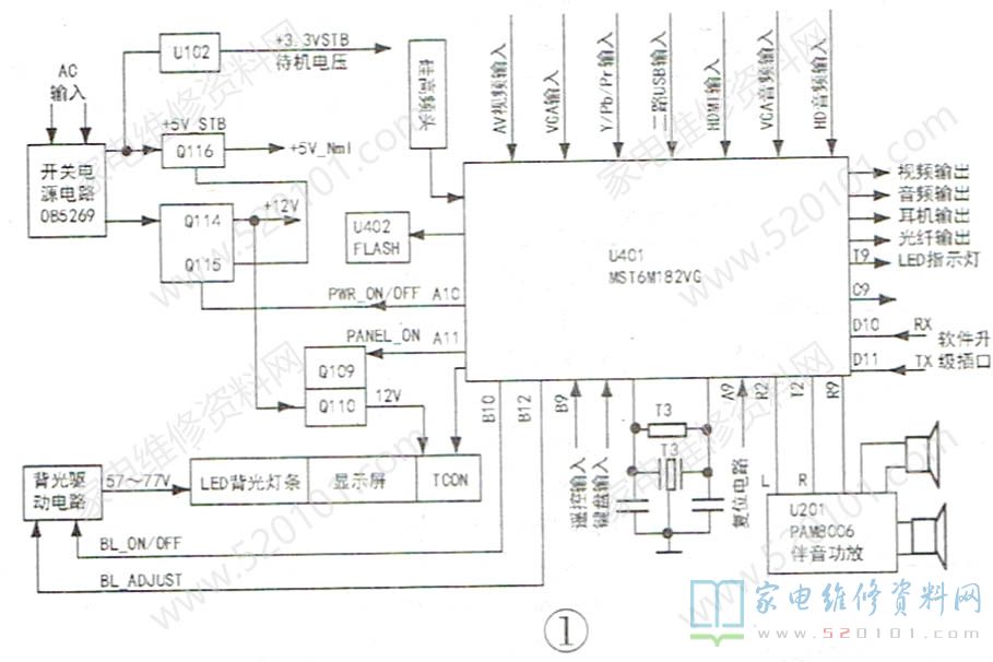 下面对该机芯彩电的开关电源和LED驱动及电源、视/音频信号流程作简要介绍,然后介绍软件升级方法,对常见故障维修进行提要说明。