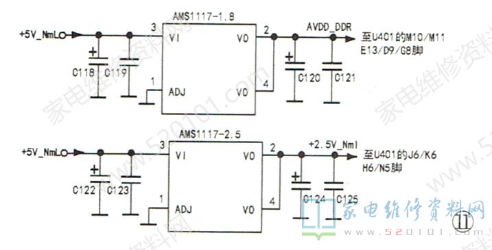 例4:一台乐华LED40C820型彩电,所有的信号源均出现满屏扭动的彩色条纹,但有声音。首先测量U401的LVDS信号输出端子的数据信号电压,发现不足1V,且大小不一(正常为1.2V左右)。LVDS 信号形成主要在主芯片中,但需要DDR存储器配合完成。DR存储器要正常工作,工作电源必须正常。于是,检查U401的DDR存储器的+1.8V、+2.5V供电,发现+2.5V电压为0V。顺藤摸瓜查过去,发现+2.5V电压输出块U104 (AMS1117-2.5 )输出端②、④脚的电压为0V,相关电路见图11。