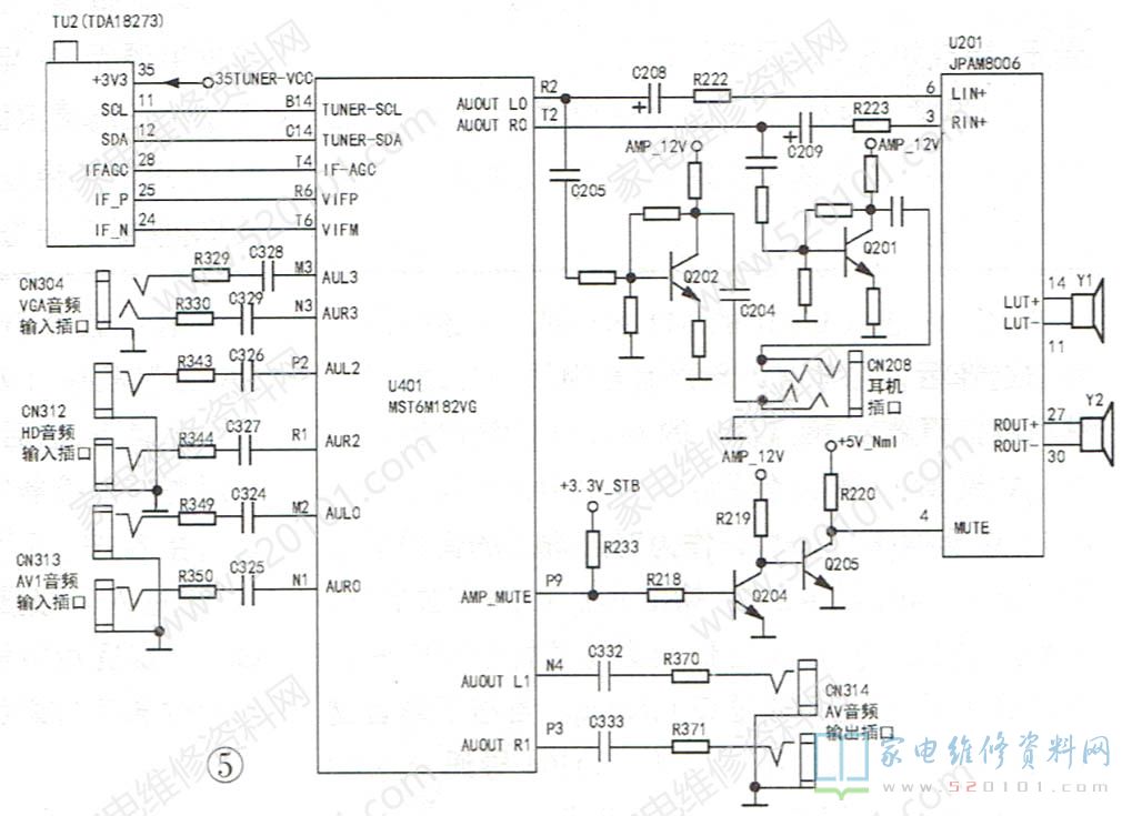例5:一台乐华LED32C820型彩电,无声音,但有图像。用万用表RX1挡分别碰触音频功放块U201的输出端14、11脚及27、30脚,扬声器中有“咯咯"声,这说明故障不是输出电路故障所导致。接下来,在耳机插孔插入耳机试听耳机中有正常声音,这进一步将故障被锁定在U201的输入电路、静音控制、供电电路及U201本身。随后,在U201的信号输入端⑥、③脚注入人体干扰信号,扬声器中无任何音响发出,于是重点检查U201的供电及静音控制电路。测得U201静音端④脚电压为4.5V,显然u201已处于静音状态。对静音电路进行检查,发现U401的静音控制端并未发出静音时的+3.3V高电平。因此,故障应在静音电路本身(相关电路见图5),检测后发现控制管Q205(BT3904)的集电极脱焊,补焊后试机,故障排除。