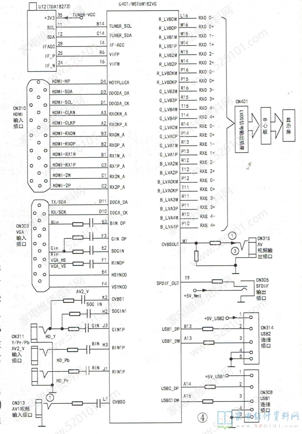 在U401的19脚输出HPDMI_HPD信号后,CN310插座送来的HDMI信号经U401的D4、D3..C1、C2等脚送到U401内部,解码后的HDMI信号再送往信号选择开关。被选择后HDMI信号经历与电视信号同样的过程后由显示屏显像。CN303插座送来的VGA信号由U401的D11、D10-.....E4等脚送入U401内部;CN311插座送来的y、Pb、Pr分量信号经U401的K2、H2.....J1等脚送入U401内部(注:AV2视频信号与Y信号插口共用,经K2脚送入);AV1视频信号经CN313插座从U401的L1脚送入U401内部。以上信号被U401内部相关信号处理电路处理及选择,也经历与电视视频信号同样的过程。CN308/CN314 插座分别为USB1/USB2输入插口,通过U401的A14、A15/B13、A13脚与外部建立USB连接。U401的T9脚为SPDIF信号输出脚,由插口CN305对外输出。U401的M1脚为AV视频输出端,经插口CN315 对外输出。