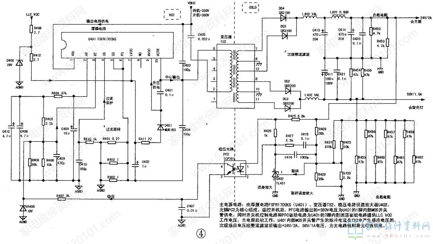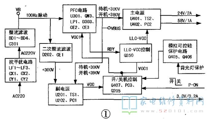 该电源板由三部分组成: 一是以集成电路FAN7930C( U301 )为核心组成的PFC功率因数校正电路,将整流滤波后的市电校正后提升到+380V为主开关电源供电;二是以集成电路VIPER17L(U201 )为核心组成的副开关电源,产生+3.3V/0.2A电压,为主板控制系统供电,同时产生VDD电压为启动后的U201供电,产生VCC电压,经开/关机电路控制后,为PFC和主电源驱动电路供电;三是以集成电路FSFR1700XS(U401 )为核心组成的主开/关电源,产生+24V/2A电压和58V/1A电压,为主板和背光灯板供电。