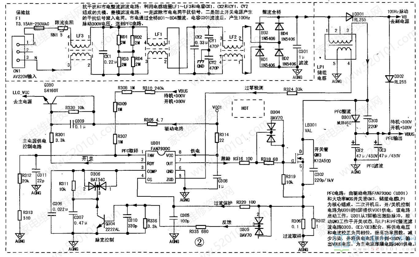 该电源板电路组成框图如图1所示,它的PFC电路原理图解见图2所示,副电源电路图解见图3所示,主电源电路图解见图4所示。