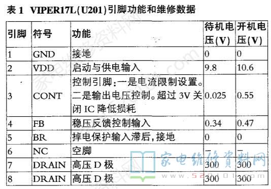 发生自动关机故障,多为以Q405、Q406模拟可控硅为核心的背光灯保护电路启动。判断方法是:在开机瞬间,测量Q405的b极电压,如果由正常时低电平0V,变为高电平0.7V以上,则是该保护电路启动。解除可控硅保护的方法是将Q405的b极对地短路。该电源板的集成电路引脚功能和维修数据见表1、表2所示。