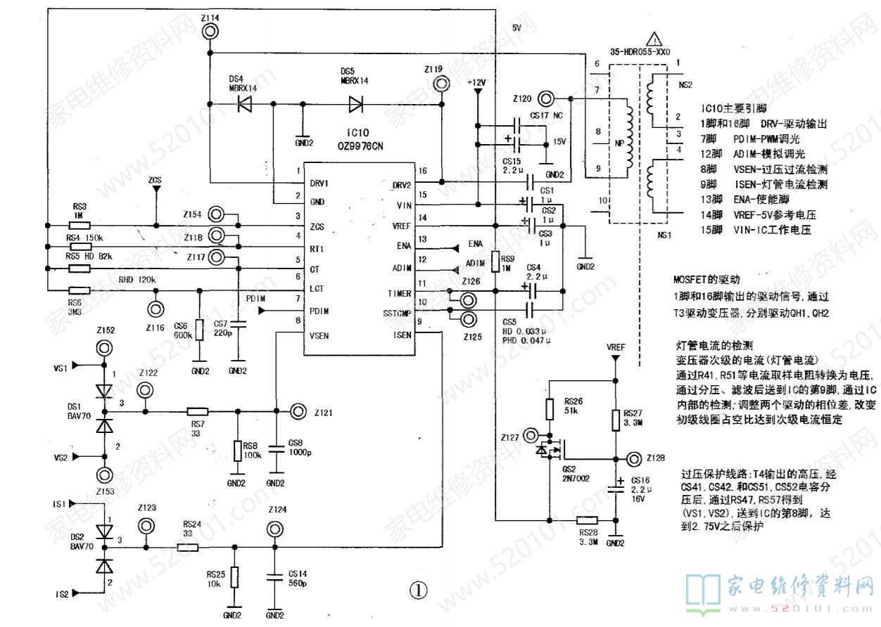 正常工作时OZ9976CN工作电压:①脚为4.0V、②脚为0V、③脚为0V、④脚为1.0V、⑤脚为0.8V、⑥脚为0.15V、⑦脚为0.5V、⑧脚为1.8V.⑨脚为0.1V、10脚为0.15V、11脚为0.15V、12脚为5.0V、13脚为4.0V、14脚为5.0V、15脚为12V、16脚为4.0V。