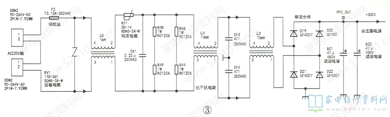 抗干扰电路利用电感线圈L5、L4、L3和电容器CX1、CY3、CY4组成的两级共模滤波电路,一是滤除市电电网干扰信号,二是防止开关电源产生的干扰信号窜入电网。图中F2为保险丝,电源板发生短路故障时烧断,断电保护电源板:RV1为压敏电阻,市电电压过高时击穿,将F2烧断,断电保护;RT1为限流电阻,限制开机瞬间大滤波电容EC1、EC2的充电电流。