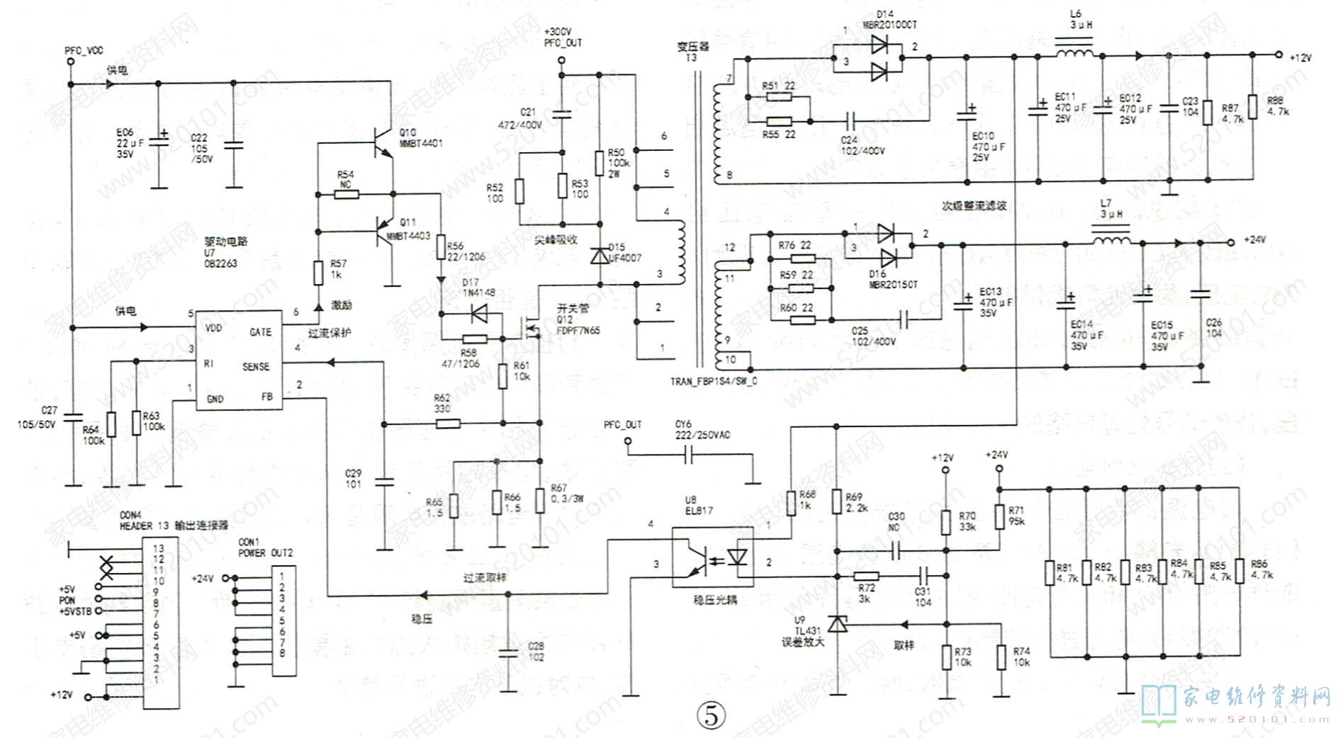 该板主开关电源如图5所示,由振荡驱动控制电路u7(OB2263)、灌流电路Q10、Q11(未安装)开关管Q12、T3和稳压电路光耦u8(EL817)、误差放大器u9(TL431 )等组成。遥控开机后启动工作,产生+12V和24V电压,为主电路板和背光灯电路供电。