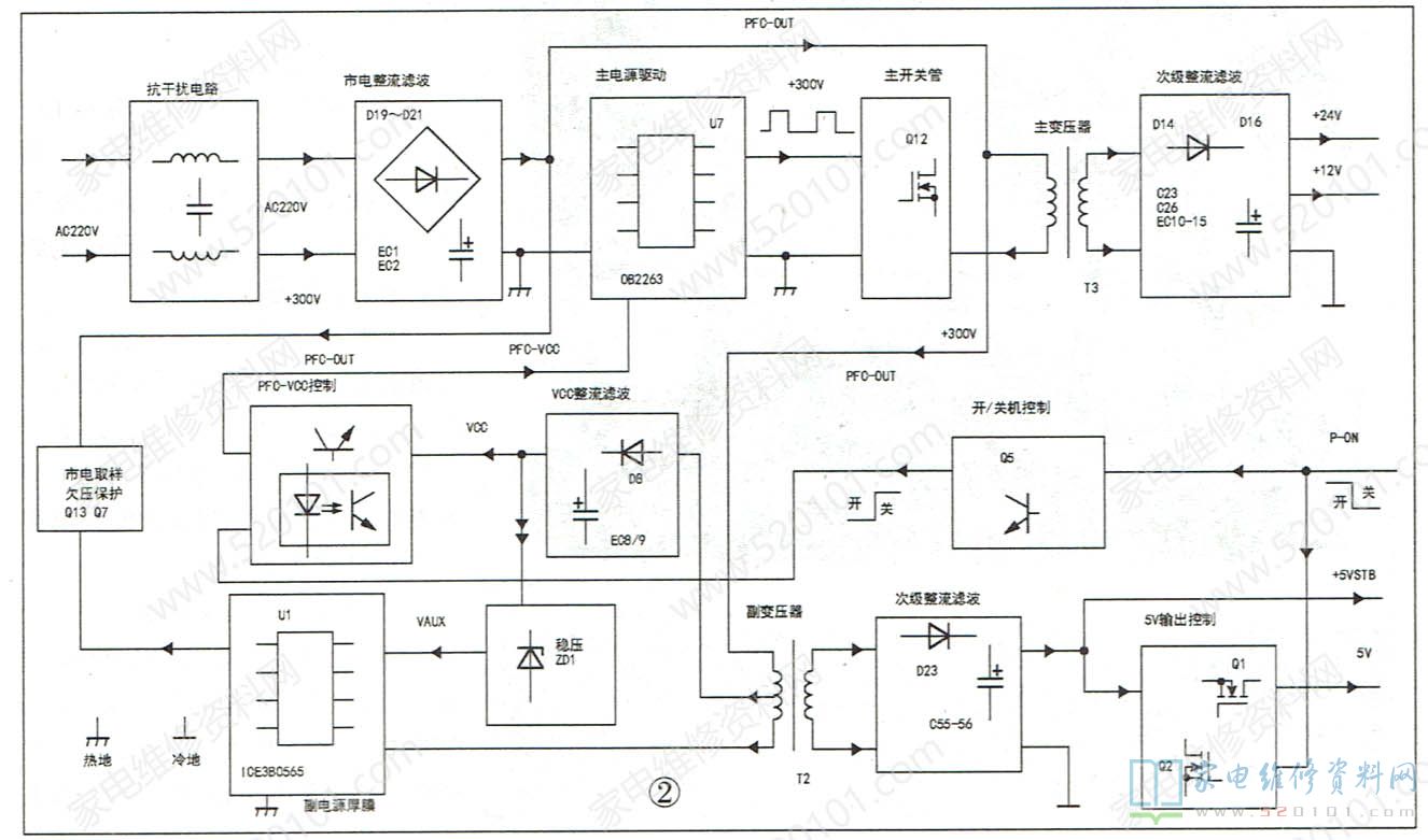 TV3205-ZC02-01A电源板由两部分组成:一是由厚膜电路ICE3B0565(U1)、变压器T2为核心组成的副电源,通电后,副电源首先工作,产生5VSB电压,为主板控制系统供电,同时5VSB电压经开/关机电路Q1控制后输出5V电压,为主板小信号电路供电;二是由驱动电路OB2263(U7)、灌流电路Q10、Q11和MOSFET开关管Q12、变压器T3为核心组成的主电源,遥控开机后启动工作,产生24V电压,为背光灯板供电;产生12V电压,为主板伴音功放等负载电路供电。