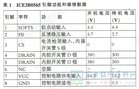 ICE3B0565是PWM控制芯片/MOSFET大功率场效应管的复合电源芯片,包括振荡器、取样稳压、驱动级等控制电路和MOSFET开关管,为单极性控制驱动输出,设有过流、过压、欠压保护功能,其引脚功能和维修参考数据见表1所示。