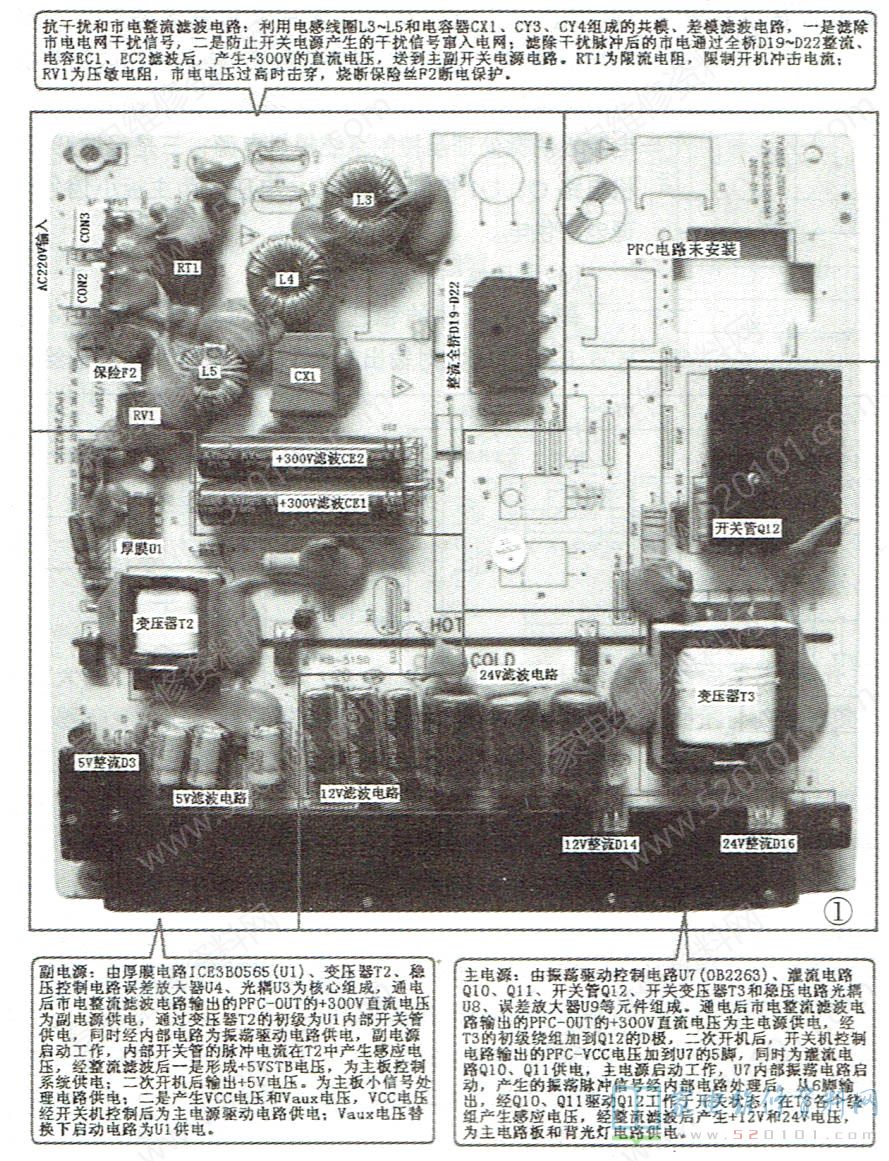 TCL LED液晶彩电采用的TV3205-ZC02-01A电源板,集成电路采用ICE3B0565+OB2263组合方案,组成副电源和主电源,副电源输出+5VSB、5V电压,主电源输出12V和24V电压,为主电路板和背光灯电路供电。应用于TCL LED32C500、LED32C100、LE32C16、LE32M18等LED液晶彩电中。