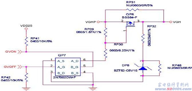 无电压,其他均有正常电压输出。分析与检修:由于逻辑板上的电压是受时序控制的,具体如:VDD25,VDD18VDA VGL VGH, 控制其VDA的是由TPS65161的27脚输出的高/低电平加至QP1(P沟道MOSFET管)的4脚,低电平MOSFET导通,VDA输出至GAMMA校正IC。测量MOSFET管的1,2,3脚为15.9V,证明VDA电压已产生,测量4脚为低电平,5,6,7,8脚仍无VDA电压输出,拆下测量发现已损坏,更换后试机VDA测试点有电压输出,图像出现一切正常,故障排除。(若无此件,可将1脚和8脚短接即可!)