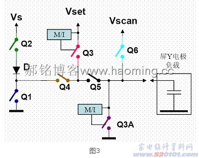 在图3中主要由Q1、Q2、Q3、Q3A、Q4、Q5、Q6七个开关组成的一个开关组合电路;图中;“屏Y电极负载”代表等离子屏的Y电极(因为等离子屏的负载特性呈容性,内部以一个电容器符号代表),上面的Vs、Vset、Vscan是由开关电压提供的稳定的直流电压(某一款进口等离子屏为例:Vs=110V、Vset=170V、Vscan=70V),要求误差为;±1V。