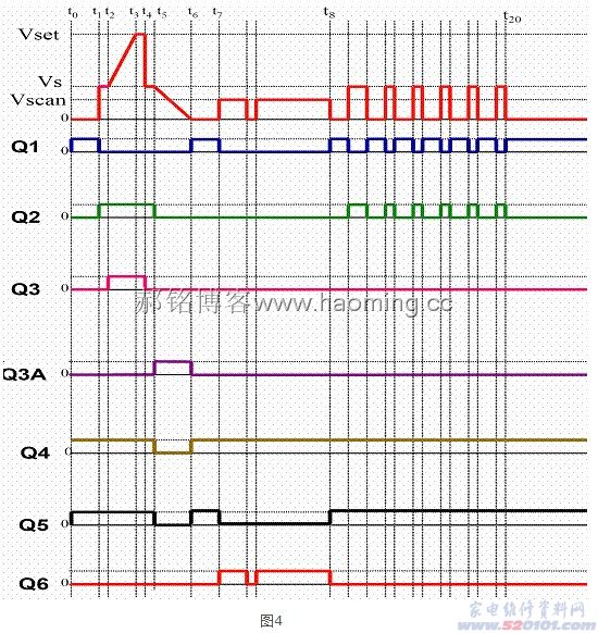图3中的Q3、Q3A两只开关,带有“M/I”符号;表示该开关在接通时内阻是由大到小逐步减小最后彻底导通,导通电流是由小到大变化(实际电路的Q3及Q3A是MOS管加反馈电路来实现)。控制Q1、Q2、Q3、Q3A、Q4、Q5、Q6这七个开关的激励控制信号如图4所示;图4中的Q1、Q2、Q3、Q3A、Q4、Q5、Q6七条激励波形图就是图3中Q1、Q2、Q3、Q3A、Q4、Q5、Q6这七个开关的激励控制信号,(这七个激励信号,由等离子屏的逻辑板电路产生)。