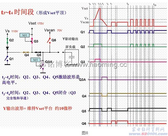 此期间;Y驱动组合开关电路工作状态如图8所示:从图8的右边 t3~t4时间阴影部分可以看出,此时:Q2、Q3、Q4、Q5激励信号是高电平;对应左边的组合开关图中的开关;Q2、Q3、Q4、Q5闭合导通;其它的Q1、Q3A、Q6激励波形是低电平;对应左边的组合开关图中的开关; Q1、Q3A、Q6是断开状态。现在Q3已经彻底导通;等效于把Vset电压加到输出端(由于二极管的存在,Vset不会倒灌到Vs),输出到屏负载;Y电极驱动波形在这个时间段为:10微秒时间Vset幅度的平台。