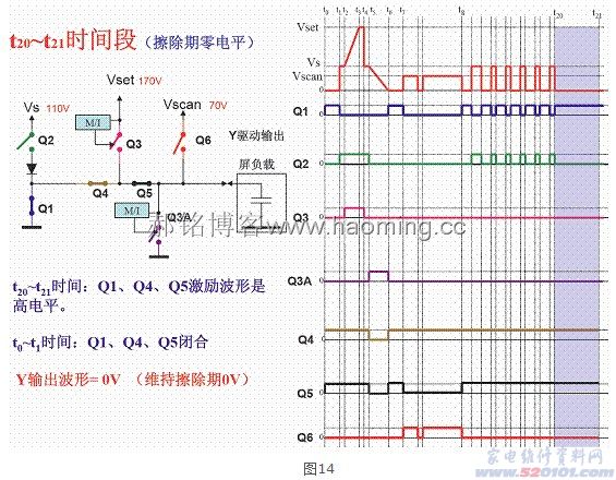 此期间;Y驱动组合开关电路工作状态如图13所示:从图13右边的 t8~t20时间阴影部分可以看出:可以看出Q4、Q5激励信号是高电平;Q4、Q5闭合导通,Q3、Q3A、Q6激励波形是低电平;Q3、Q3A、Q6断开,Q1、Q2激励信号是交替变换的方波;Q1、Q2是轮流导通;Q2导通瞬间Vs幅度的电压加到输出端,输出到屏负载的Y电极驱动波形在这个时间段为:Vs幅度的交流方波。