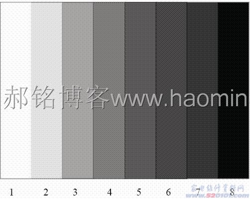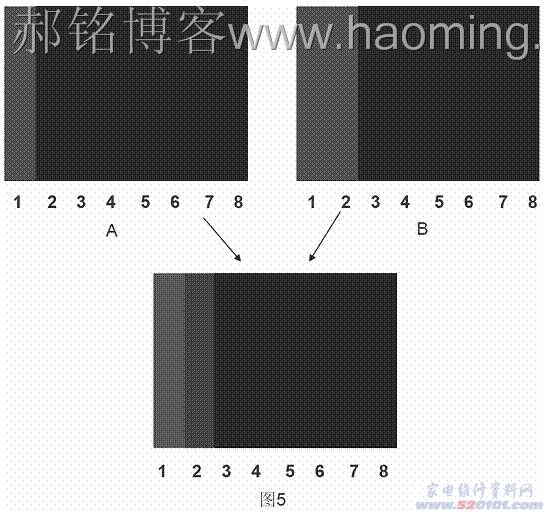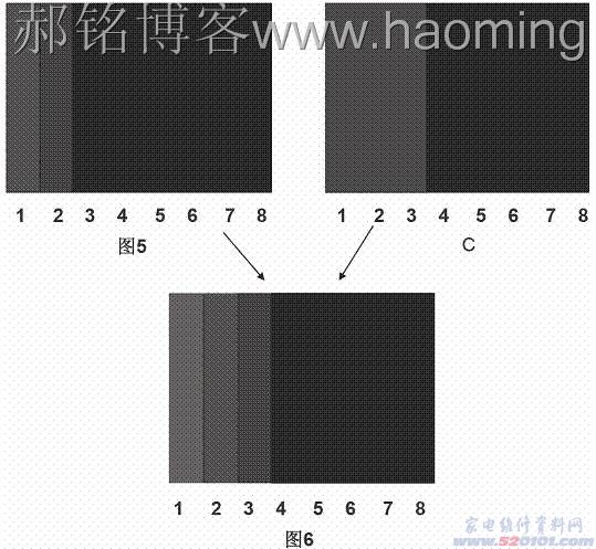 当把图A和图B重叠在一起成为图5;图5的1号条部位分别是图A和图B两个1号条亮度的叠加;亮度分量提高一倍,图5的2号条部位则接受了图B的2号条的亮度分量(图A2号条部位为“黑”),这样图5就是一幅具有两级亮度等级变化的图像;1号条亮度高于2号条亮度;3至8号条为“黑”(通过A和B图的叠加后的图像已经具有灰度了)。