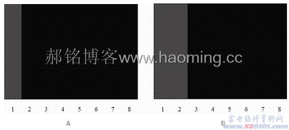 图A和图B都是只有“亮”与“黑”两种状态的图;图A;只有1号条“亮”、2至8号条为“黑”,图B;只是1号条、2号条“亮”、3至8号条为“黑”。