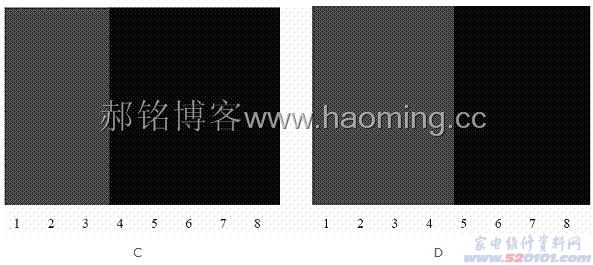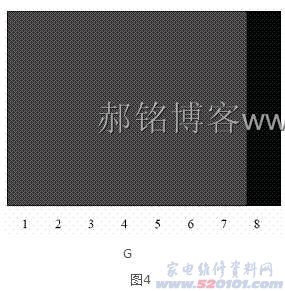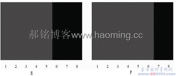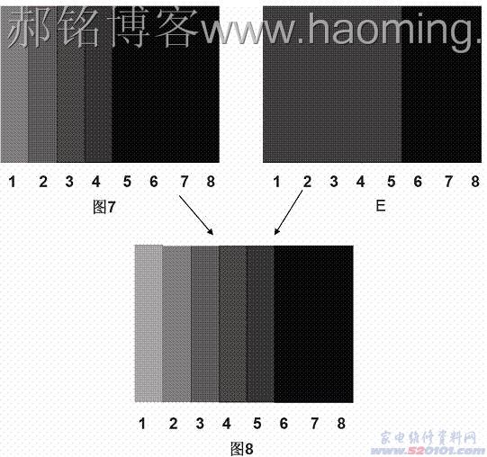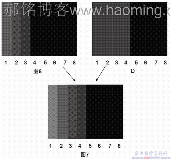 一幅层次丰富的图像,我们可以把它看成是一层一层图像的叠加组合。这样每一层图像的结构就简单的多了,例如一个修理、检验电视机的简单的黑白灰度等级测试图画面,图3所示;就是一个具有定量亮度灰度等级变化的图片;特点是有8条垂直排列的不同亮度的亮带;从左到右亮度是分等级的逐级变暗,下面标注1、2、3、4、5、6、7、8数字以示区别,1号条最亮;8号条最暗(黑),中间的2、3、4、5、6、7号亮度条;亮度逐级变暗,每两条之间的亮度变化一个级差,共有7个级差。我们逐层的分解,可以看出这个灰度等级图可以分解为七幅图;每一幅图;都是只有“亮”、“黑”两种状态的简单图像。如图4所示;A、B、C、D、E、F、G七幅图像。因为这每幅图像只有“亮”、“黑”两种状态,由等离子屏产生是没有问题的。