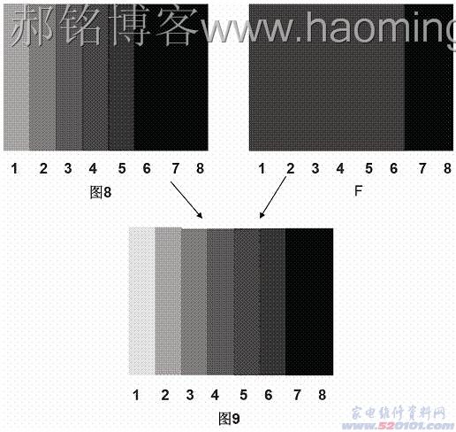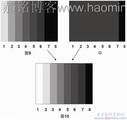 接下来;第四步、第五步、第六步;依此类推把图E、图F、图G依次叠加,得到图8图9最终得到图10的一幅完美的标准的七级灰度等级的测试图。(原理同上,不在赘述)