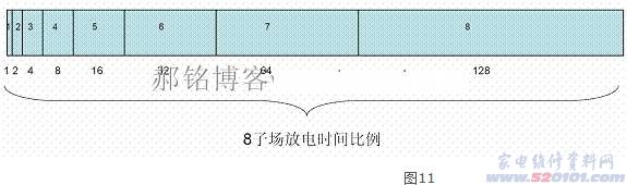 等离子放电腔体的发光亮度和该腔体放电的次数成正比,我们在每个子场中的维持放电阶段,把放电的时间设定不同(维持放电脉冲的频率都是在子场中都是相同的,只有控制子场放电的时间就控制了亮度),其8个子场维持放电阶段放电时间的位权值分别设置为:1、2、4、8、16、32、64、128,这是8个子场放电的时间比例;图11所示(这8个数相邻之间都是倍数关系)。这8个数全部相加等于255加上“黑”屏正好256,也就是在屏上某一个位置的像素点的发光,都是由8个子场这个部位的叠加形成。这个256就是亮度等级,第256级就是最亮的级别。如果需要得到由0到256之间的任何一级亮度;就可以用这8个等级中的相关级别叠加就可以了。例如我们需要得到152级别的亮度;就选取:128+16+8=152。如果要得到173级别的亮度;就选取:128+32+8+4+1=173。这样不同的任意亮度发光的像素点都可以获得了。