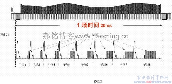 在一个正常的电视场频时间内;例如50赫兹场频其场时间是20Ms(毫秒),就要容纳8个子场,每个子场的维持放电期间的时间不同,但是8个子场时间加起来正好是一场时间20毫秒(场频为50赫兹),如图12所示。